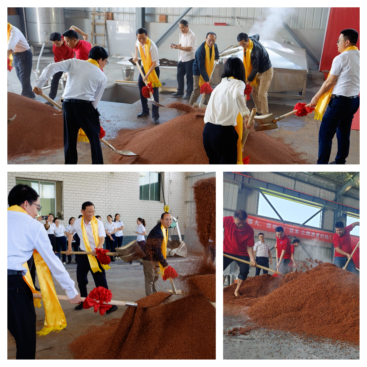 會(huì)議結(jié)束后,眾人移步至雅大酒廠釀造車間進(jìn)行揭牌儀式 ,并與工人們一起進(jìn)行醬香型白酒釀造的“下沙” 環(huán)節(jié)。