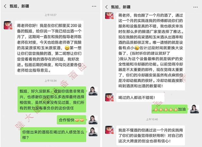 5月10日甄姐收到設(shè)備并開始安裝,1個(gè)月后發(fā)酵的第一鍋高粱酒發(fā)酵完成,這期間雅大售后陳老師一直與甄姐保持聯(lián)系,從泡糧、蒸糧、下曲、發(fā)酵每個(gè)過程都一對一視頻指導(dǎo)。